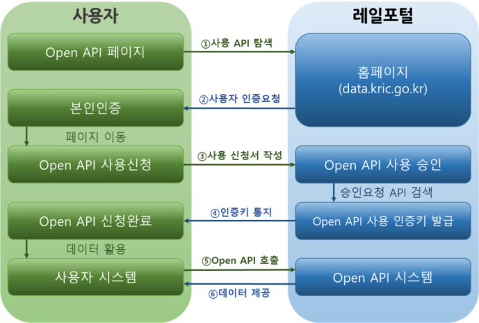 이용안내 Open API 활용 신청 절차 Open API 활용 신청 절차 회원가입 후 OPEN API 사용을 위한 인증키를 발급받습니다. 발급된 하나의 인증키 정보를 이용해 다수의 OPEN API를 사용합니다. 현재 발급된 인증키를 폐기 후 새로운 인증키 발급이 가능합니다. 과도한 데이터 트래픽이 발생하는 경우 사용 제한이 있을 수 있습니다.